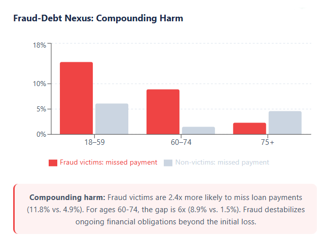Victims are 2.4 times more likely to miss loan payments compared to non-victims (11.8% vs. 4.9%). For adults aged 60-74, this gap becomes a six-fold increase (8.9% vs. 1.5%). These downstream effects—missed payments, damaged credit, and cascading fees—extend the harm far beyond the initial stolen amount. For an older adult on a fixed income, a single undetected scam can trigger a chain reaction that is incredibly difficult to recover from.