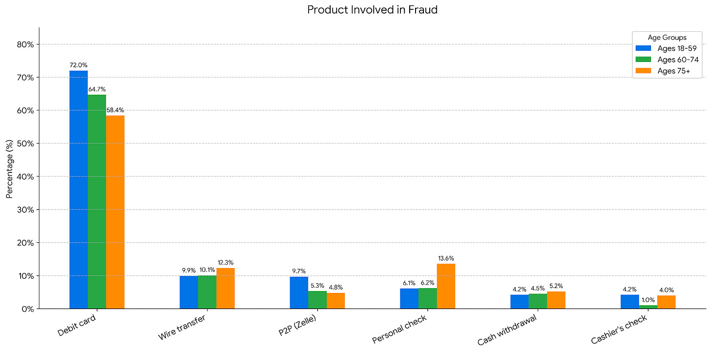 Generational differences in banking products highlight where these vulnerabilities lie. While debit card usage dominates across all ages, it declines from 72% for younger adults to 58% for those 75+. Conversely, older adults rely more heavily on traditional, harder-to-reverse channels: personal check usage surges to 14%, and wire transfers climb to 12%. Meanwhile, P2P app usage (like Zelle) drops to 5%. Fraud tactics may be evolving, but the exploited infrastructure remains traditional.