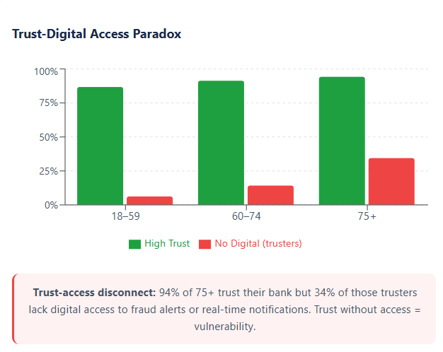 94% of adults 75 and older trust their primary bank — the highest rate of any age group. At the same time, 34% of adults 75+ have no digital access: no mobile app, no web login. For this group, real-time fraud alerts and digital safeguards may not be reaching them through the channels their bank primarily uses.