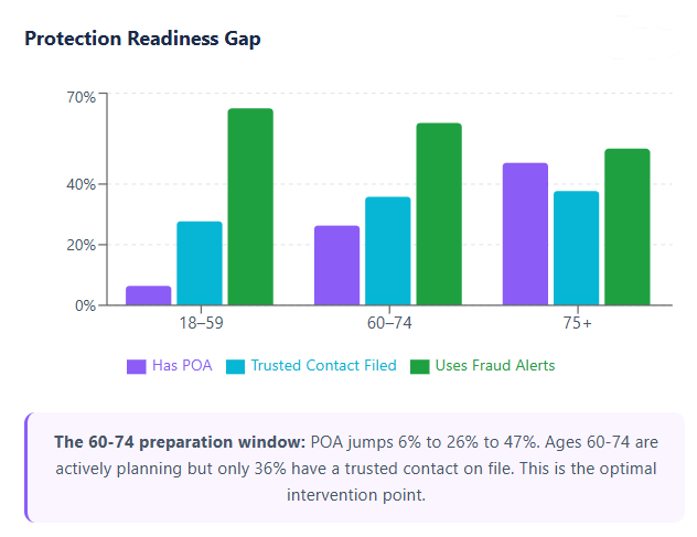 Financial safeguarding behaviors shift dramatically around retirement age. Power of Attorney adoption quadruples from 6% (ages 18-59) to 26% (ages 60-74), eventually reaching 47% for those 75+. However, the rate of having a trusted contact on file plateaus after age 60, and active fraud alert usage actually declines. The 60-74 age band represents the optimal window for financial institutions and advocates to intervene and establish safeguards before habits set in and vulnerabilities compound.
