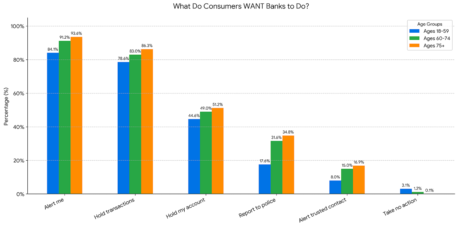 While there might be a concern that proactive fraud interventions might feel paternalistic to older consumers, the data firmly contradicts this. The data firmly contradicts this. As the chart illustrates, rather than resenting bank involvement, the oldest consumers actually demand the highest levels of intervention. Across every protective measure, whether it is issuing direct alerts, holding suspicious transactions, or escalating to law enforcement, adults 75 and older consistently prefer more aggressive, proactive action from their banks than younger demographics. The desire for institutions to simply “take no action” is effectively zero.