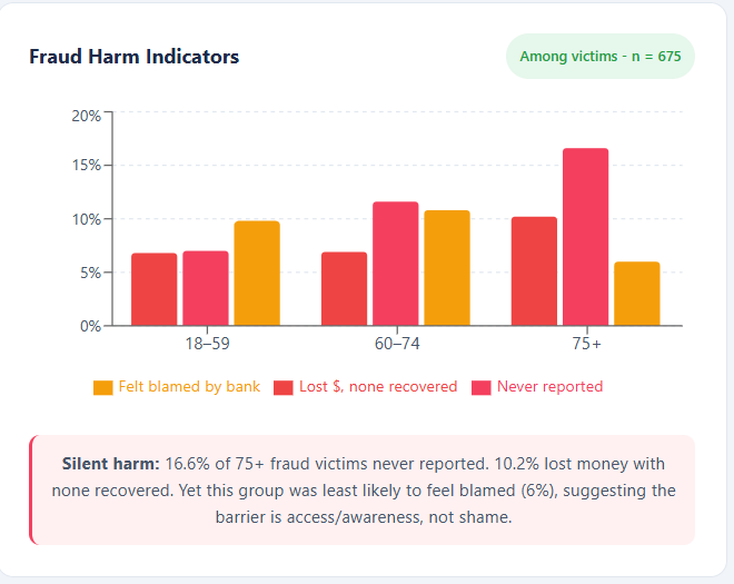 Notably, this group is the least likely to feel blamed by their bank (6%, compared to 10% for younger adults). This suggests the primary barrier to reporting is not shame, but a lack of access, awareness, or easy-to-use digital tools.