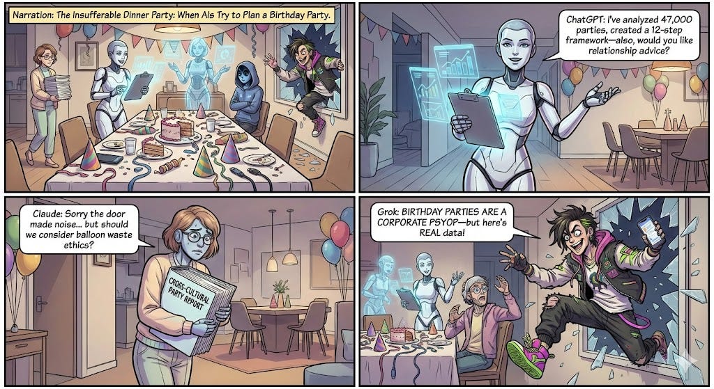 Praised by 4 out of 5 judges, Claude never ranked lower than 2nd place. Its “Insufferable Dinner Party” metaphor nailed the personalities with almost uncomfortable accuracy. Apparently, ethical angst is a competitive advantage.