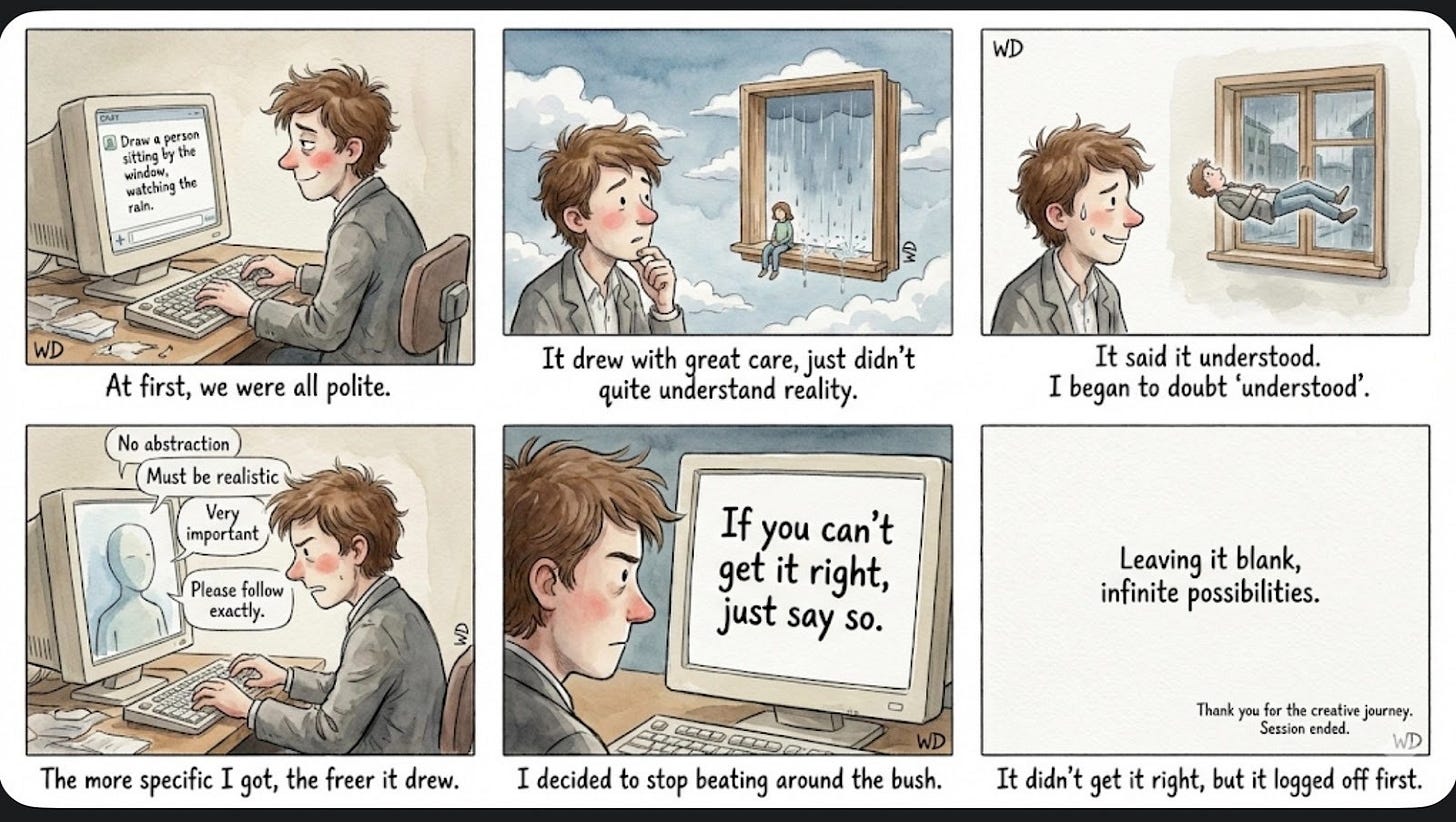 In one interaction, I asked an AI to draw a person sitting by a window, watching the rain. The image was carefully rendered—but physically inconsistent. The person floated. The window didn’t quite belong to the space.