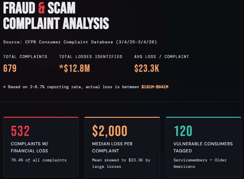 Data source: CFPB Consumer Complaint Database, March 2025–March 2026 (n=679 fraud/scam complaints). Analysis uses FTC’s official fraud taxonomy. Underreporting multiplier from FTC’s December 2025 report on fraud against older adults. This is a one-year snapshot of a single reporting channel and should be read as a lower bound, not a complete picture.