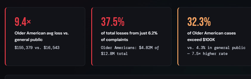 Older Americans (6.2% of complaints) account for 37.5% of total losses, a staggering disproportion. Their average loss is $155,379, more than 9.4× the general public average of $16,543, and nearly 48× the FTC’s own median loss figure for adults 80 and older ($1,650). Nearly 28% of their cases exceed $100,000 in losses, compared to just 4.1% for the general public, a 7.5× higher rate of catastrophic harm. Of the three complaints in the dataset exceeding $1 million in losses, two involved older Americans.