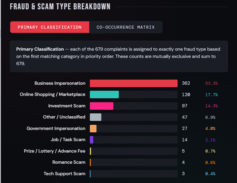 Business impersonation dominates. More than half of all complaints (53.3%) involve fraudsters posing as your bank, calling to “protect” you from the very fraud they’re committing.