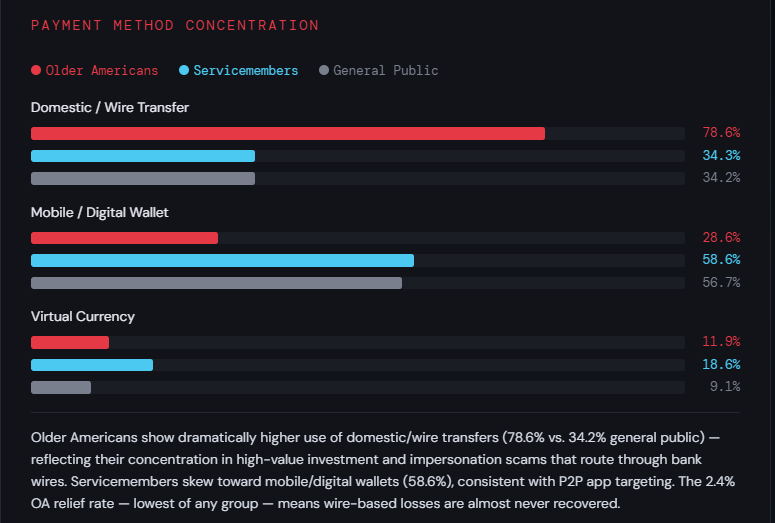 The relief rate for Older Americans is 2.4%, the lowest of any group. That means for every 100 older adults who file a complaint, fewer than 3 receive any monetary relief. Wire transfers and cryptocurrency, the dominant payment methods in high-value elder fraud, are effectively irreversible once sent.