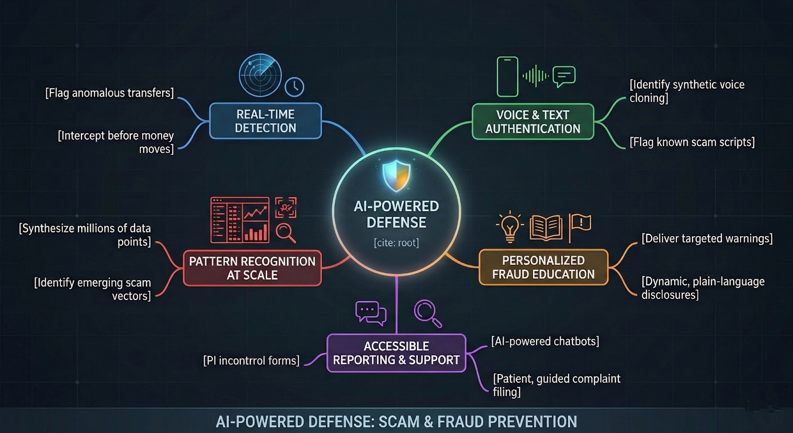 Voice and text authentication: AI-powered fraud detection can identify synthetic voice cloning in real time, flagging calls that match known scam scripts or exhibit audio artifacts of AI generation.