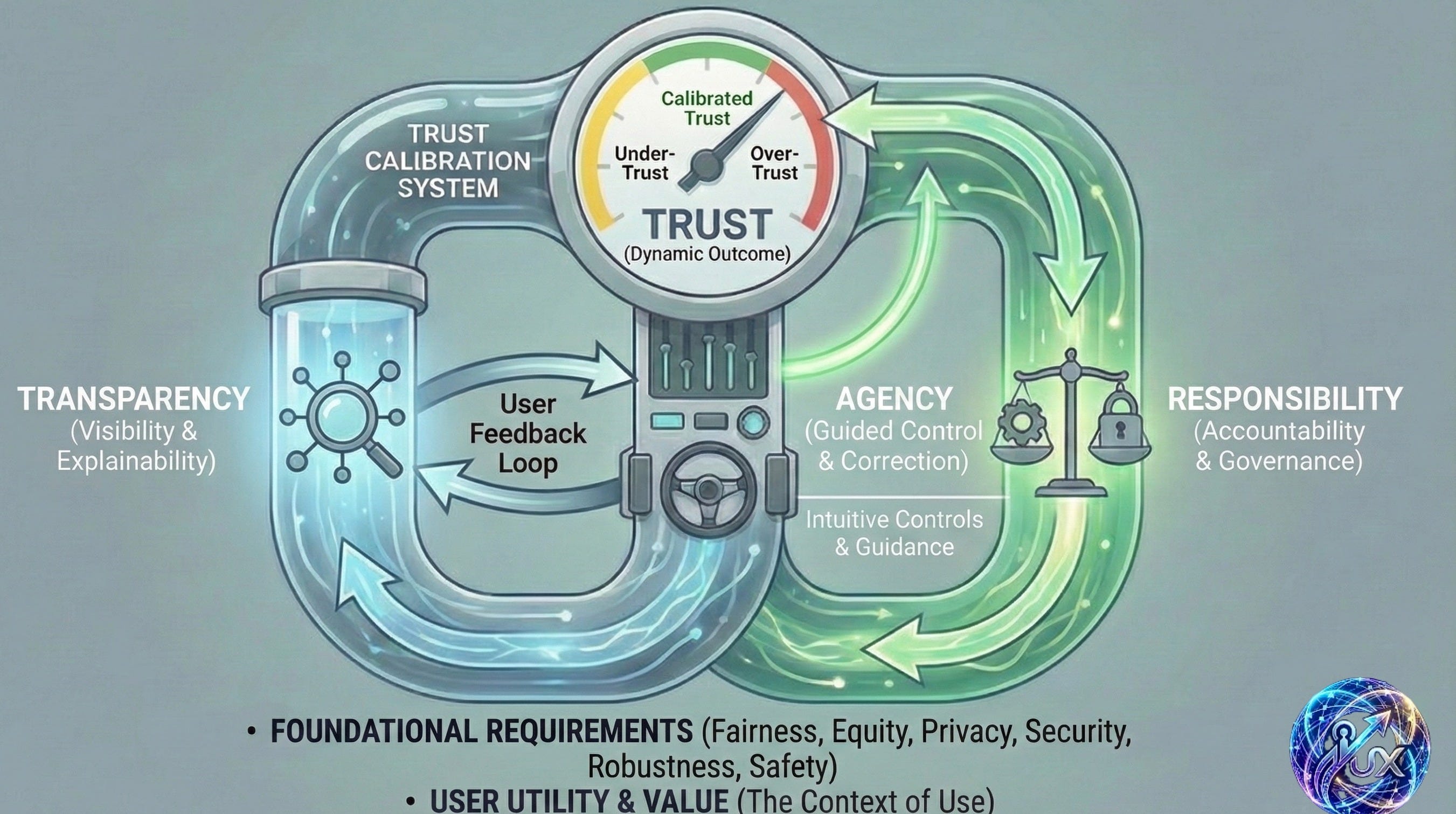 This requires moving away from static frameworks—like the “pillars of trust”—toward a dynamic system. The Trust Calibration System visualizes this as an infinity loop, where three mechanisms work together to align user confidence with system capability.