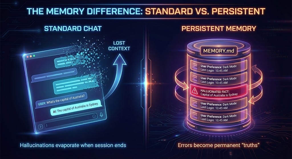 But it introduces Persistence of Error. In standard chat, hallucinations evaporate when sessions end. In persistent memory, hallucinated facts become permanent “truths” governing future actions. Error gets laundered into trusted knowledge.