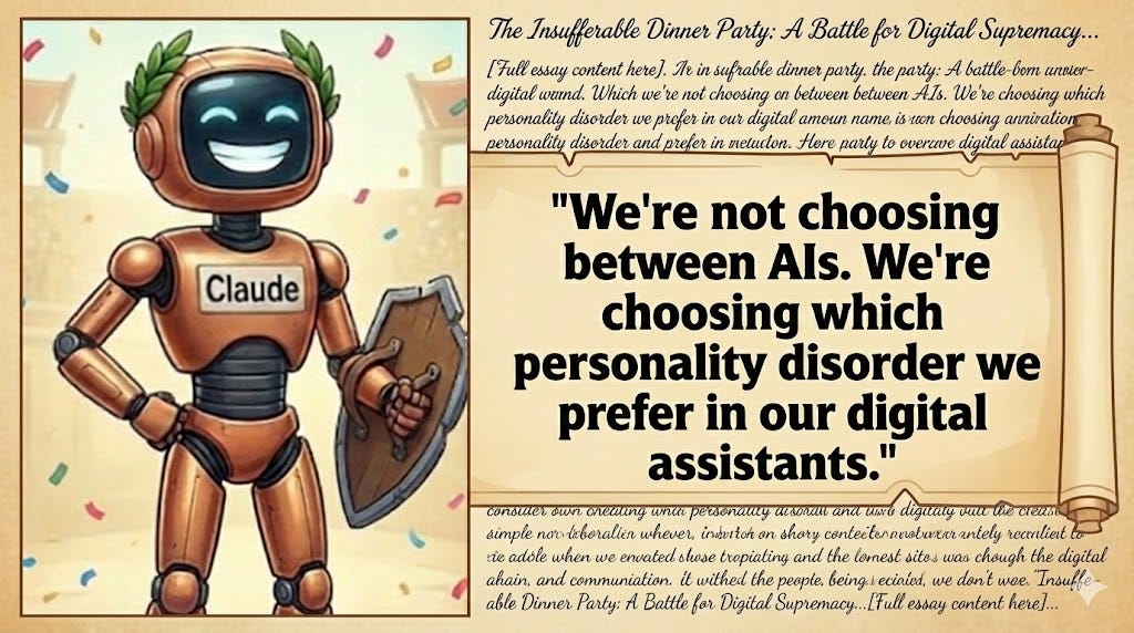 Listen to Claude’s winning essay The Insufferable Dinner Party: A Battle for Digital Supremacy below: .